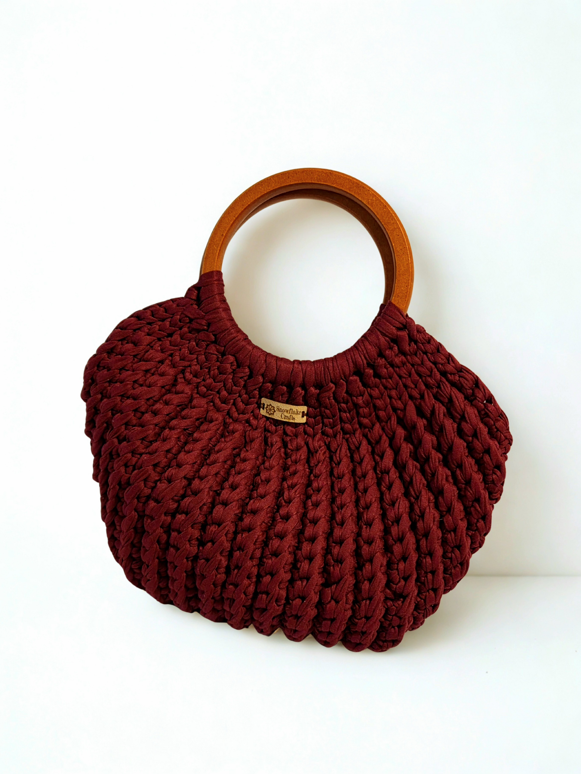Hand crocheted in t-shirt yarn with comfortable wooden handles and hidden popper closure inside.